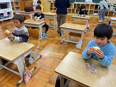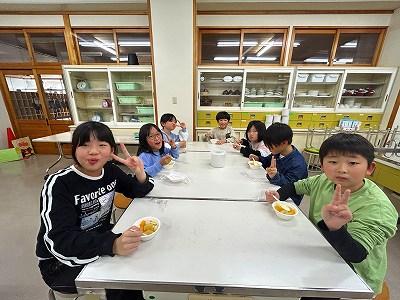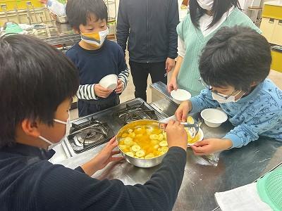 2学期をがんばった1・2年生は、そのご褒美として今日、お楽しみ会を行いました。先ずは、自分たちの好きなフルーツやゼリーがたくさん入ったフルーツポンチを作って食べました。