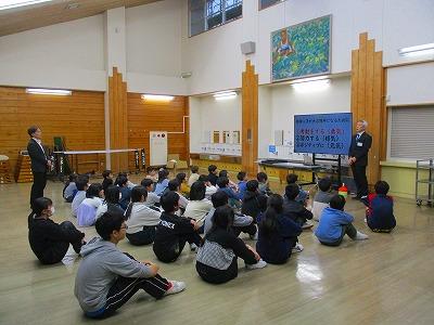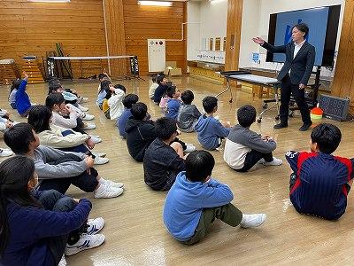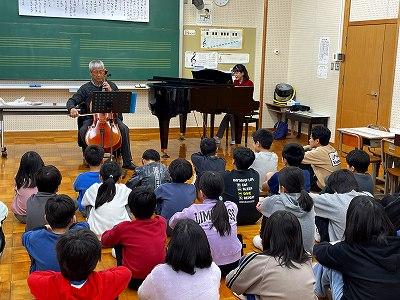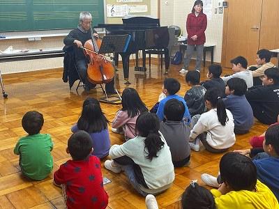 学校評議員でもある勝井 寛さんと、小学校の先生である屋敷 恵さんによるクリスマスミニコンサートが行われました。勝井さんのチェロと、屋敷先生のピアノによる演奏や、児童も演奏に合わせて合唱するなど楽しいひとときを過ごしました。