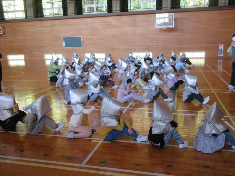 防災頭巾を被り、【おかしもて[】を守って避難行動をとることができました。