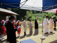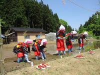11月の「新嘗祭」に向けて、献納米の苗を植える「御田植式」に高学年の女子が参加しました。「御田植式」では着物に赤い前掛けの早乙女の衣装に着替え、秋の豊作を願って苗を丁寧に手植えしました。おおきく育ち、秋にはおいしいお米になることを願っています。