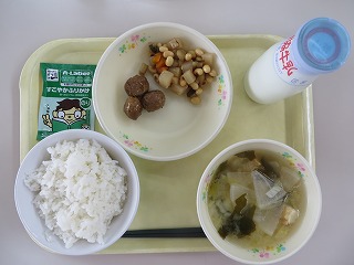 ごはん ミートボールの甘辛 大豆の五目煮 みそ汁 ふりかけ 牛乳