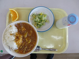 大豆入りカレーライス サラダ オレンジ 牛乳