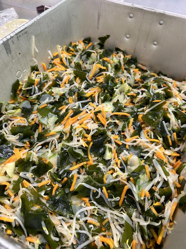 今日の副菜は、「太きゅうりの酢の物」です。太きゅうりの皮を縞模様にむき、薄く切って和えました。