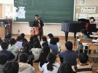 学校評議員の勝井さんと、屋敷先生,5,6年生によるミニ音楽会が開かれました。全部で8曲を、時には全員で合唱しながら楽しみました。