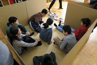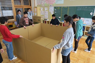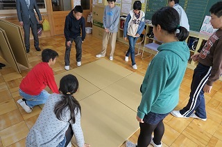 今日は、主に被災後に関する内容を町役場の先生から教えて頂きました。非常持出袋の紹介や非常食の試食、避難用だんボール畳の体験等どれもためになる内容ばかり。最後に防災検定問題を解きながら、防災講座のまとめをして防災意識を高めました。