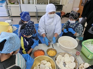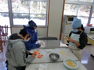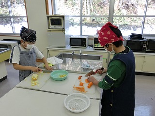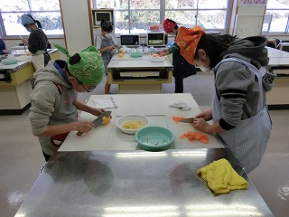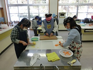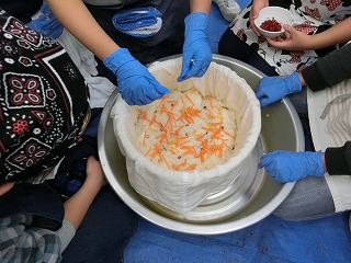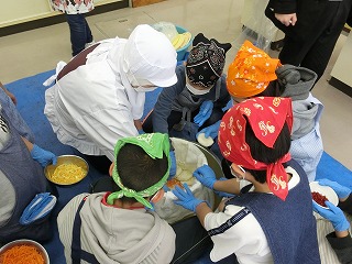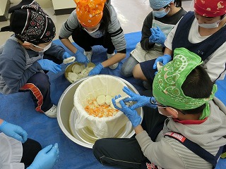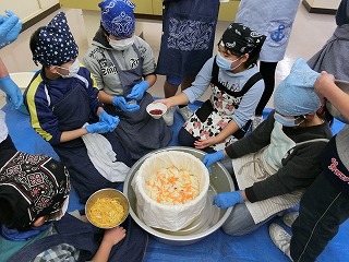曽良かぶらずし生産組合の先生方にご指導いただき本漬け作業をしました。作業は、順にさばを挟んだり、人参・柚・唐辛子・麹・タレ・酢をふりかけたりと丁寧で慎重な作業が必要でしたが、5年生は大変上手にしていました。今日の体験を通じて、ふるさとの素晴らしさをさらに知ることができました。