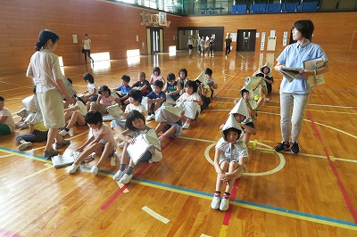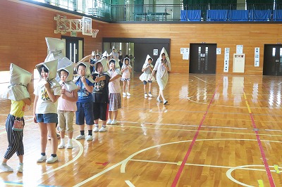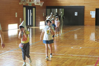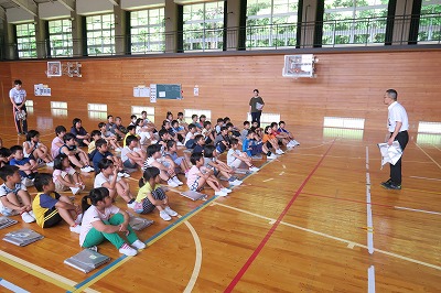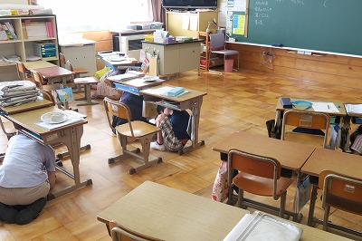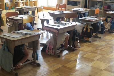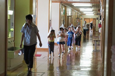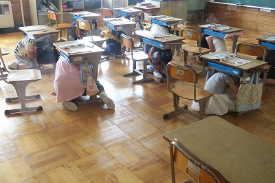 大地震が発生した想定で、各自がどう行動したらよいかをあらかじめ考えたり、安全行動をとる訓練をしました。(県下一斉) 安全行動とは、 ①しゃがむ ②隠れる ③じっとする の3つです。この後、本校独自で地震発生に伴い原子力災害が発生した想定で、防災頭巾を被って体育館へ一次避難をして、その後家族への引き渡しを想定して地区ごとに整列する練習を行いました。