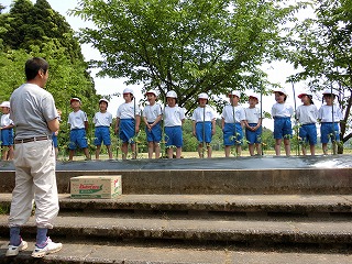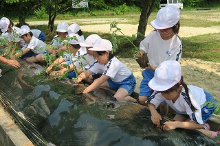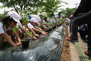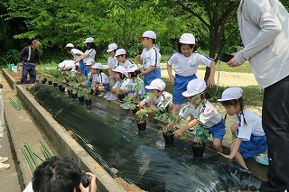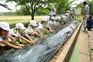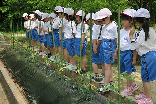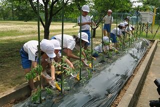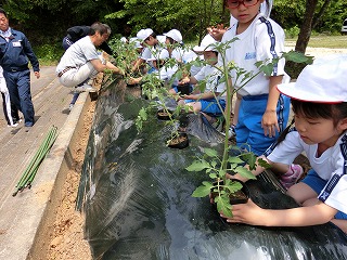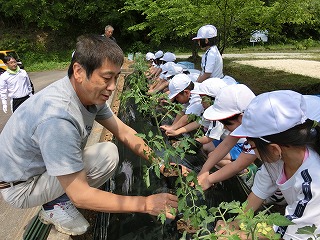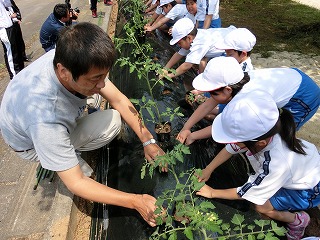 1・2年生は、学級園にミニトマトの苗植えをしました。これは、ふるさと教育の一つです。トマト農家の勝井先生から苗の植え方、美味しいトマトの育て方など教えていただきました。苗を丁寧に植えた後、最後にトマトの成長を願ってきれいな水と明るい歌声のシャワーをかけてあげました。今後は、収穫したトマトを使った簡単な料理も計画中です。