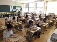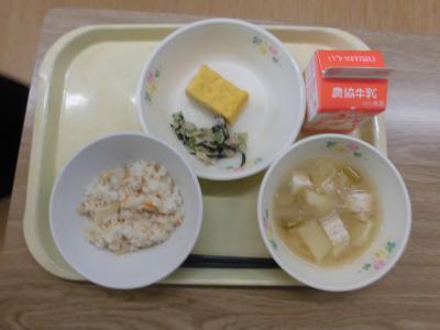 今日29日の給食は、たけのこご飯、厚焼きたまご、ツナとひじきのサラダ、ジャガイモと玉ねぎの味噌汁、牛乳です。子ども達は「たけのこ大好き!」と言いながら、今が旬のたけのこご飯をおいしそうに食べていました。