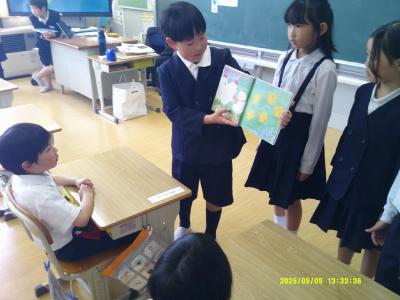 4、5月は、全学年が1年生と交流する時間を設定しています。今回は3年生が図書館で選んだ本の読み聞かせをしてくれました。終わった後、1年生からの「あーおもしろかった!!」と言う声に3年生もとてもうれしそうでした。3年生、ありがとう。