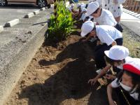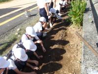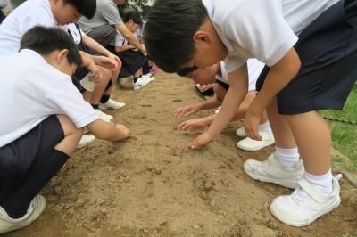 2年生は生活科で、秋冬野菜の大根の種まきをしました。野菜の栽培は根気がいりますが、これまで育てた野菜との違いを観察したり、収穫を楽しみにしながら、大切に育ててほしと思います。