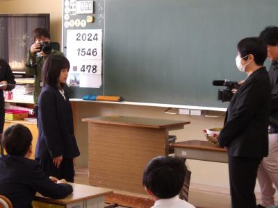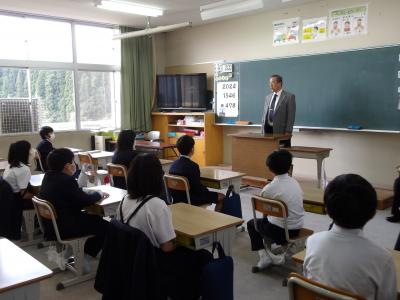 穴水町より5年生に、偉人マンガ「不屈の武将 長連龍」が贈呈されました。大間教育長の挨拶後、マンガを監修した金沢学院大学の東四栁史明名誉教授にマンガの魅力や長連龍の魅力についてお話をしていただきました。マンガは4、5、6年生に配付され、授業等で活用します。