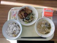 メニュー:能登産の柔らか栗の混ぜごはん、石川県産豚のサクサクとんかつ、口がさっぱりのほうれん草と人参のごまあえ、大根の味噌汁、ごはん、牛乳、ポテトデザート
