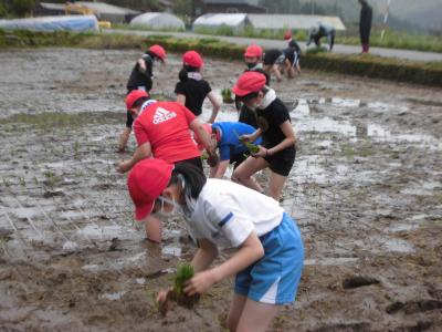 5月19日、5年生は、ふるさと学習の一環として田植えを体験しました。泥水の中を歩くことの難しさや腰をかがめて植える大変さなどを実感しながらも、田植えを楽しんでいました。秋の収穫が楽しみです。ご協力いただいた下唐川地区の皆様、本当にありがとうございました。