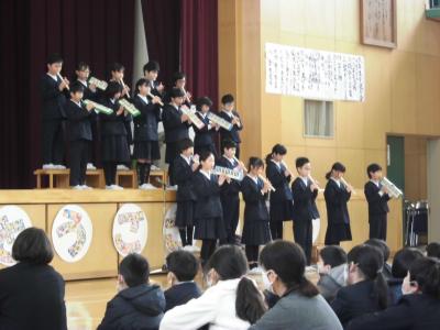 1月は縄跳び月間です。19日、昼休み、体育委員が1年生から3年生に縄跳びの技を披露しました。そのあと、さっそく新しい技に挑戦する子ども達の姿がありました。明日は4年生から6年生に技を披露します。全校で「目指せ、縄跳び名人!」
