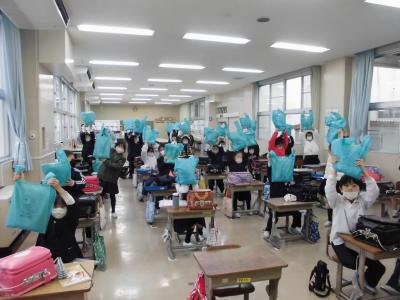 12月14日(月)穴水町から全校児童に「感染予防セット」が配付されました。「手指消毒用アルコールジェル・手洗い用せっけん液・ウエットシート・不織布マスク・マスクケース」が入っています。