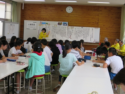 人権教室では,SMAPが歌って大ヒットした「世界に一つだけの花」の歌詞に込められた願いについて考えました。「自分自身のよさ」と共に「周囲の人のよさ」にも目を向けることの大切さについて講師の方からお話がありました。