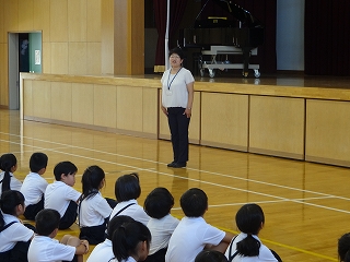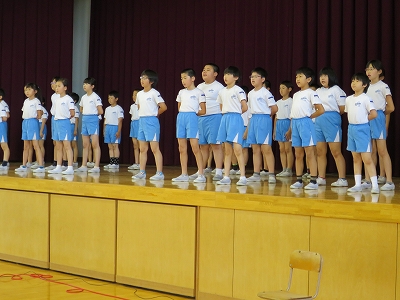 委員会からのお知らせ,今月の歌に続いて,4年生の学年発表がありました。「雨だれピアノ」など3編の詩を,体育館中に響き渡る大きな声で発表してくれました。
