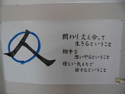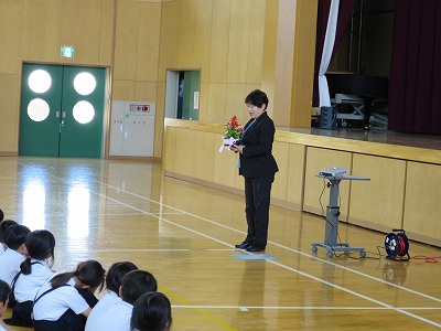 その後,「人権の花」を手にされた校長先生から,「人」という漢字の成り立ちや,相手を思いやることの大切さについてお話がありました。