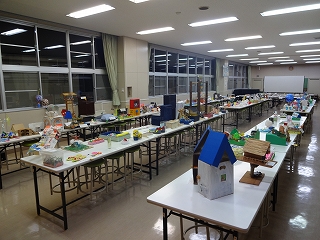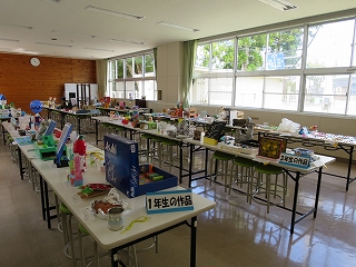 夏休みに子どもたちが頑張って取り組んだ工作や自由研究が,ランチルームに展示してあります。