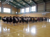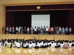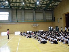 生徒指導の先生からは,一日8時間過ごしている学校で掃除の時間はたった15分であること,その15分間で学校をきれいにしなければならないこと,そのためには無言でまじめに真剣に取り組むこと,のお話がありました。 みんな,真剣に聴いていました。