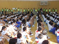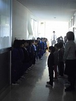 | 子供たちは,毎月最後の日に,今月の歌を廊下で合唱しています。 今日は,朝から太陽の光がまぶしい日となりました。 キラキラと輝く朝日のなかで,子供たちの歌が校舎中に,元気に響き渡りました。 | |