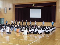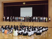 本日5限目,全校集会が行われました。 各委員長さんは,堂々と今月の目標を発表し,今月の歌の練習では,まだあまり歌っていないのに,暑さを吹き飛ばすような元気な声で歌うことができました。 4年生は,全員の声を一つにして,体育館いっぱいに詩の朗読をひびかせました。 心がこもっていて,何より一生懸命で,大変じょうずで,立派でした。