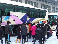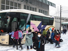 先週の中頃までは,雪が降らず,別コースも考えていましたが,今回の寒波で無事スキー宿泊体験が実施できました。BG体育館で出発式を行い,8時頃全員揃ってバスに乗り出発しました。