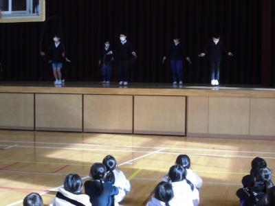 今日は、体育委員が1~3年生に目指す技の実演をしてくれました。1年生からは「すごい!」「はやい!」と感心する声がたくさん聞こえ、実演の後の練習では、みんないつも以上に熱心に練習に取り組んでいました。一か月、皆でなわとびを楽しんでほしいと思います。