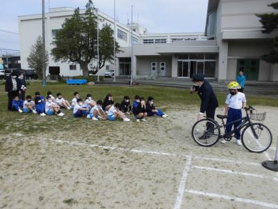 4月21日、中高学年対象に交通安全教室を開催し、自転車の点検の仕方や、実際に乗りながらルールを確認しました。自転車はヘルメットの着用が義務付けられています。ヘルメットを着用し、ルールを守り、安全に気を付けて自転車に乗ってほしいと思います。