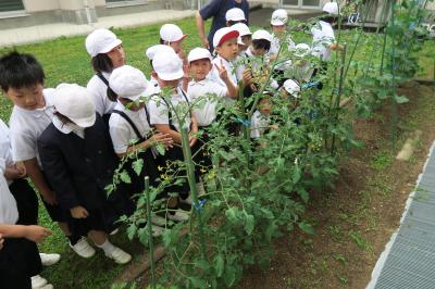今日はみんなで、生活科で育てている野菜を収穫しました。自分達が育てた野菜の収穫に大喜びの子どもたちの笑顔がうれしい時間でした。