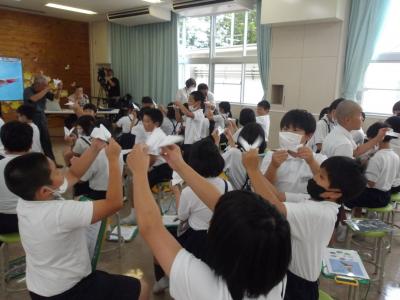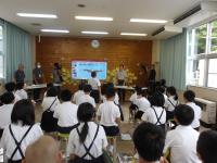 2023年7月18日 09時29分14日、3,4年生対象にふるさと学習の一環として「トキ授業」を行いました。講師はトキファンクラブの宮下会長です。写真や映像を見ながら、本州最後のトキ「能里」捕獲についてや、 トキが再び大空を舞う環境を目指すファンクラブの活動などについて学びました。子どもたちは、最後にトキが再び穴水町の空を飛ぶことを願いながら、折り紙のトキを羽ばたかせました。