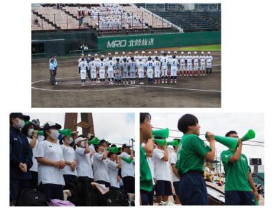 結果は残念ながら0-10で敗退しましたが、ツーベースヒットや満塁の場面などたくさんの見せ場を作り、全員が自分の役割をしっかりと果たし、力を尽くして戦ってくれました。暑さをものともせず全校生徒が力一杯応援し、大きな声が球場に響き渡り、選手を後押ししました。