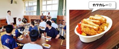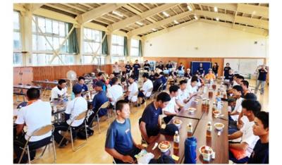 練習試合後は選手交流会・激励会として、寺井高校野球部保護者会の皆さんによるカツカレーの炊き出しが行われ、おいしくいただきながら、楽しい交流会が行われました。選手は自己紹介したり、ポジションや好きな野球選手を聞いたりと楽しい時間を過ごしました。