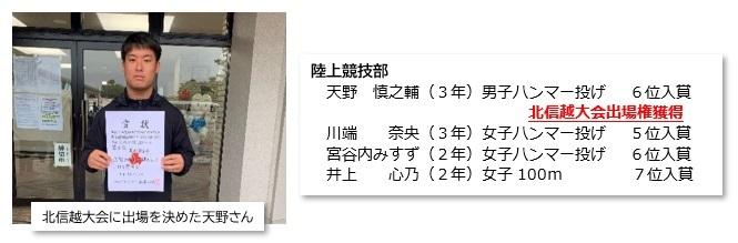 その他、髙こゆきさん(2年)が女子円盤投げで8位、苗代さんが5位、女子やり投げで髙さんが6位入賞、女子走幅跳で大西彩愛さん(1年)が7位入賞と健闘しました。