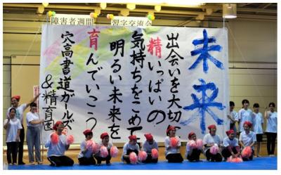 10月5日(木)、穴水町にある障害者支援施設「精育園」で、本校書道ガールズ7名と精育園の利用者4名と職員が合同で書道パフォーマンスを行いました。