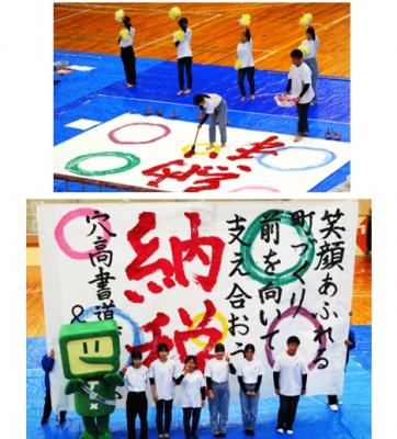 奥能登3校(日本航空高校石川、能登高校、穴水高校)の書道部が招かれ、税をテーマに各自で文言を考案し、学校毎にそれぞれパフォーマンスを行いました。穴水高校書道ガールズ&ボーイは「納税」の文字を大きく書き上げ、集まった人たちへ税の啓発と書道の魅力をアピールしていました。3校の作品はそれぞれの市町の公共施設等で展示される予定となっています。