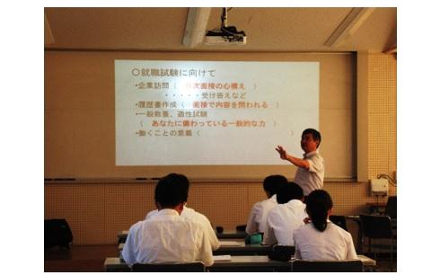 8月22日(火)、3年生就職希望者を対象に就職試験に向けた面接指導が行われました。進路指導担当より、就職試験に向けてどんな準備をすれば良いか、企業が求める人材とは、高校時代に身に付けておくべき事柄、社会人としてのマナーや仕事についての心構えなどについて詳しい説明がありました。