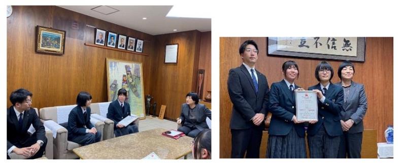 12月8日(月)、英語技能検定2級合格者並びに「優秀団体賞」受賞報告会が穴水町役場で行われました。穴水中学校の生徒3名と穴水高校の生徒2名が大間教育長を前に、受賞の喜びについて英語でスピーチしました。また、本校の英語教諭である四ツ井諒太先生が受験率伸長差部門で「優秀団体賞」を受賞したことを大間教育長に報告しました。穴水高校生は日頃からALTの先生と活発に会話しており、「使える英語」を目標にしています。