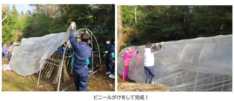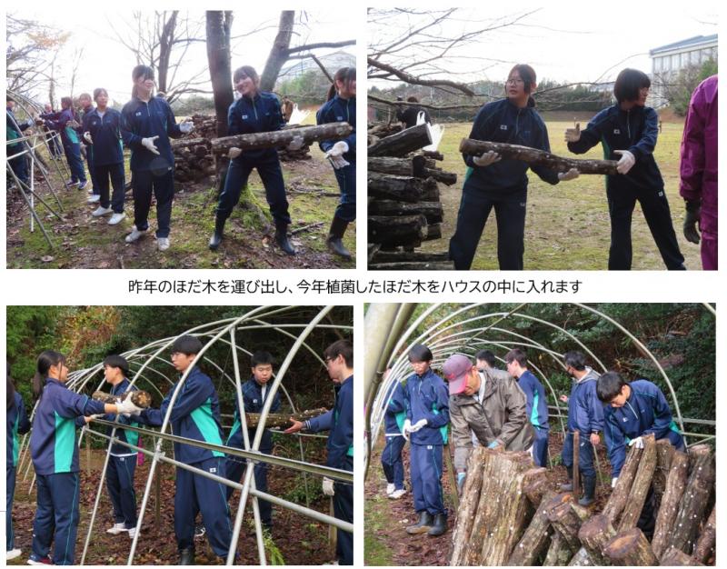 地元生産農家の高森正治さんや県農林総合研究センターの八島武志さんらのご指導のもと、約200本の「ほだ木」をハウスに移動した後、骨組のパイプの上にビニールシートをかぶせました。天候に恵まれ、冬の日差しが注ぐ中、生徒たちは手際よく短時間で作業を終えることができました。