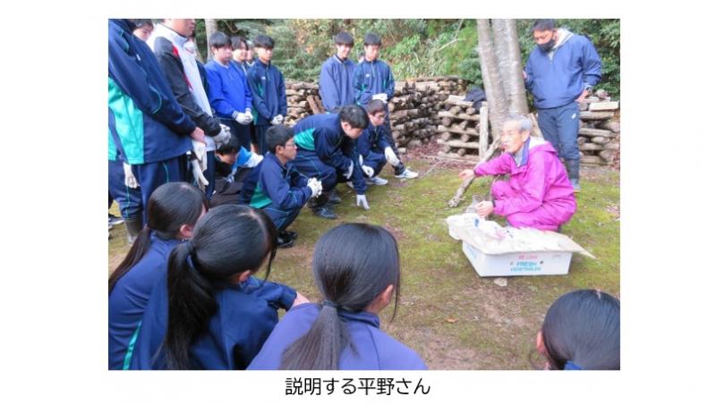 近年まで日本きのこセンター技術主幹を努められていた平野伸夫さんから今後の世話の仕方について説明していただきました。平野さんは「とにかく水やりが一番大切です。一日も休まず水をたっぷりと与えてほしい。それから袋掛けのタイミングを見逃さずに全員でしっかり見ていくことが大事。係の生徒やその日の当番に任せるのではなく、そろそろ袋掛けだな、と思ったら次の日の当番にそれを伝えるなど、全員が毎日シイタケを見守っていく心づもりでやって下さい。良い『のとてまり』が育ってくれることを期待しています。」と励ましの言葉をいただきました。生徒会長の関晴斗さんは「先輩たちの伝統を受け継ぎ、昨年よりももっと大きい、質の良い『のとてまり』をみんなで育てていきたいです。」と感想を述べました。今後2年生全員で水やりや温度管理、袋掛けなどの世話をしていきます。