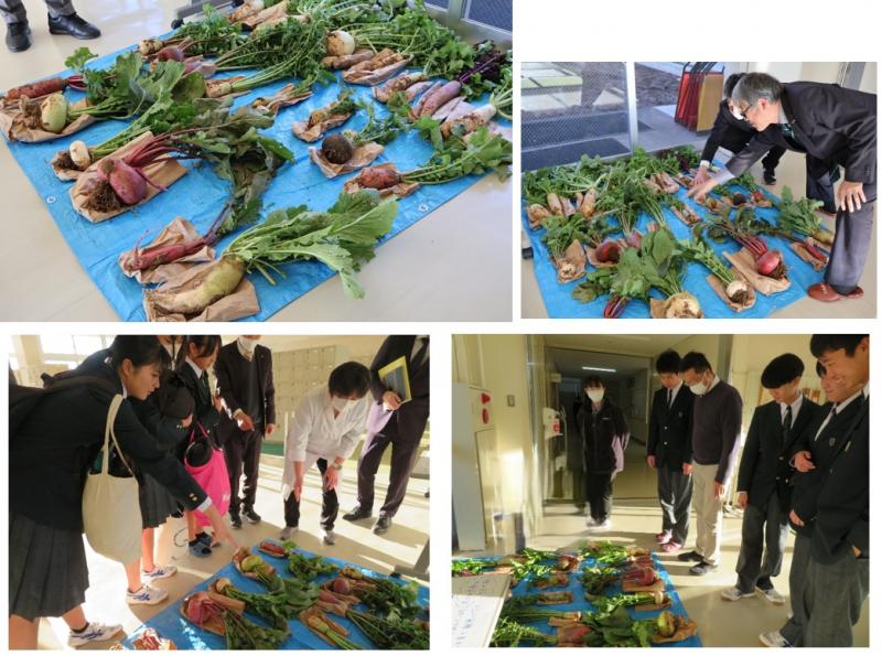 生徒たちは玄関にたくさん並べられているダイコンやカブを見て、変わった形や色とりどりの野菜を見て「食べたらどんな味がするのかな」「赤いダイコンを初めて見た!」などと話し、興味深そうに見たり触ったりしていました。