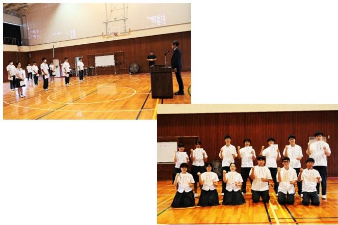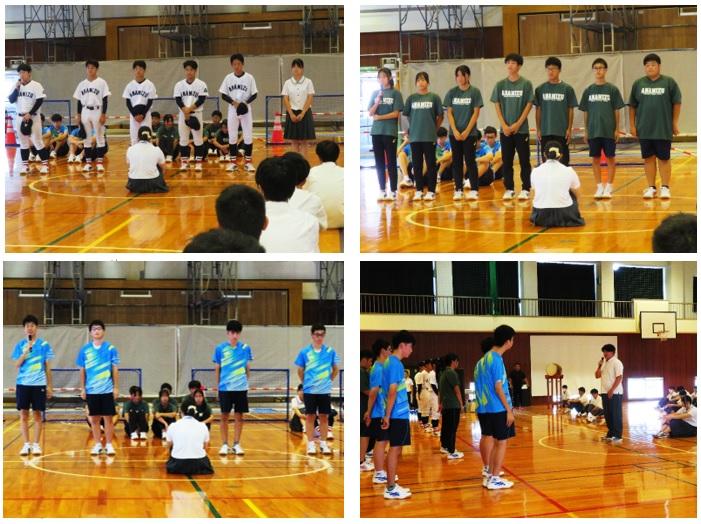 出場する野球部、陸上競技部、卓球部の部長がそれぞれ決意表明を行いました。前期生徒会長の橋本智徳さんは「先輩が引退して初めての、チームの力が試される大きな試合です。今までとはプレッシャーのかかり方も違うと思いますが、まず一勝を目指し自分の持てる力を発揮できるよう頑張って来て下さい。」と述べ後輩達を激励しました。