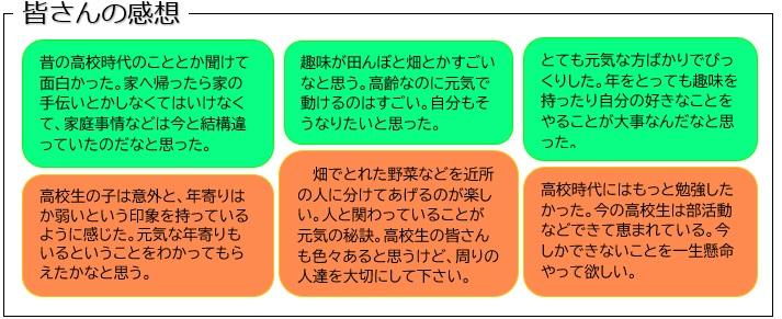 核家族化が進み、日頃から高齢の方々と接する機会が減ったと言われていますが、生徒達はたくさんの質問を通して、自分たちの世代との違いや意外な共通点、これまで生きてきた経験や人生観に触れ、有意義な時間を過ごしました。