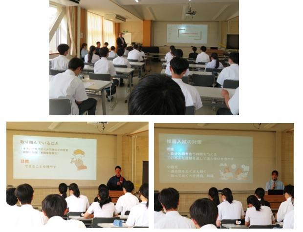 講師に昨年度の卒業生の牛上大輔さん(民間就職)、黒田莉央さん(公務員)、髙こゆきさん(進学)の3名をお招きして、現在の自分の状況や仕事内容について、高校時の進路実現に向けた取り組みなどについて話をしていただきました。講話の後はディスカッション形式の質疑応答を行い、生徒からの質問に答えながら、これから進学を目指したり、就職を希望する後輩にアドバイスしていただきました。