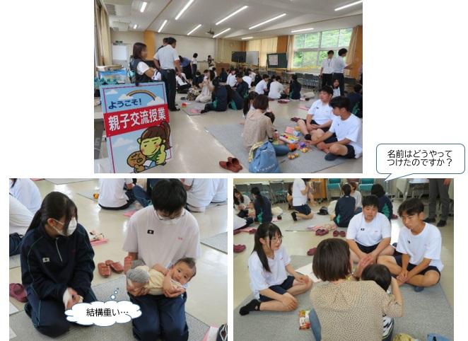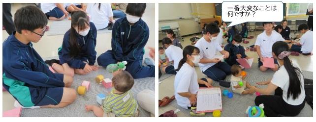 生徒たちは3、4人のグループに分かれ、そこに1,2組の親子がゲストとして加わり、子育てについて質問したり、乳幼児と遊んだりして交流を持ちました。
