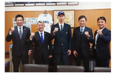 11月26日(火)、本校野球部東野魁仁さん(3年)がプロ野球独立リーグ・日本海リーグの石川ミリオンスターズに地元枠で入団が決まり、端保聡代表取締役、納谷嶺太編成担当から指名あいさつを受けました。東野さんは「能登の人達に自分の活躍を是非見て欲しい。」と述べ、決意を新たにしていました。