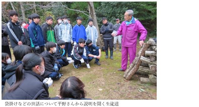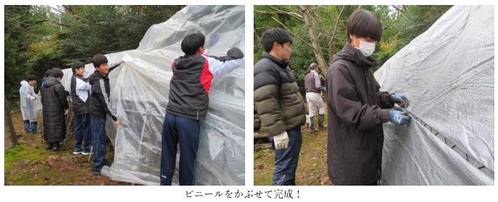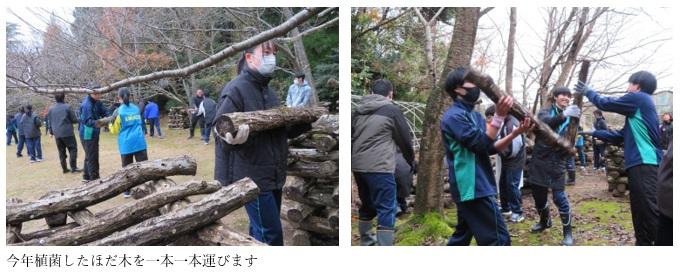 「のとてまり」栽培の一環として、5月に植菌した「ほだ木」をビニールハウスに入れる作業を2年生全員で行いました。地元生産農家の高森正治さん、県農林総合研究センターの八島武志さん、昨年まで日本きのこセンター技術主幹を努められていた平野伸夫さんらのご指導のもと、200本の「ほだ木」をハウスに移動した後、骨組のパイプの上にビニールシートをかぶせました。