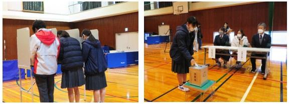 受付や投票管理者・立会人は生徒が務め、実際の場合と同様の手続きを踏み、生徒達は真剣な面持ちで、本当の選挙と同じ緊張感を味わいながら投票を行っていました。