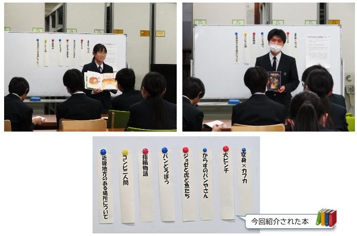 各クラスの図書委員が集まり、自分の好きな本をみんなの前で紹介しました。持ち時間は5分間で、ライトノベルやエッセイなど色々なジャンルから生徒達は自分のお気に入りの本について語りました。